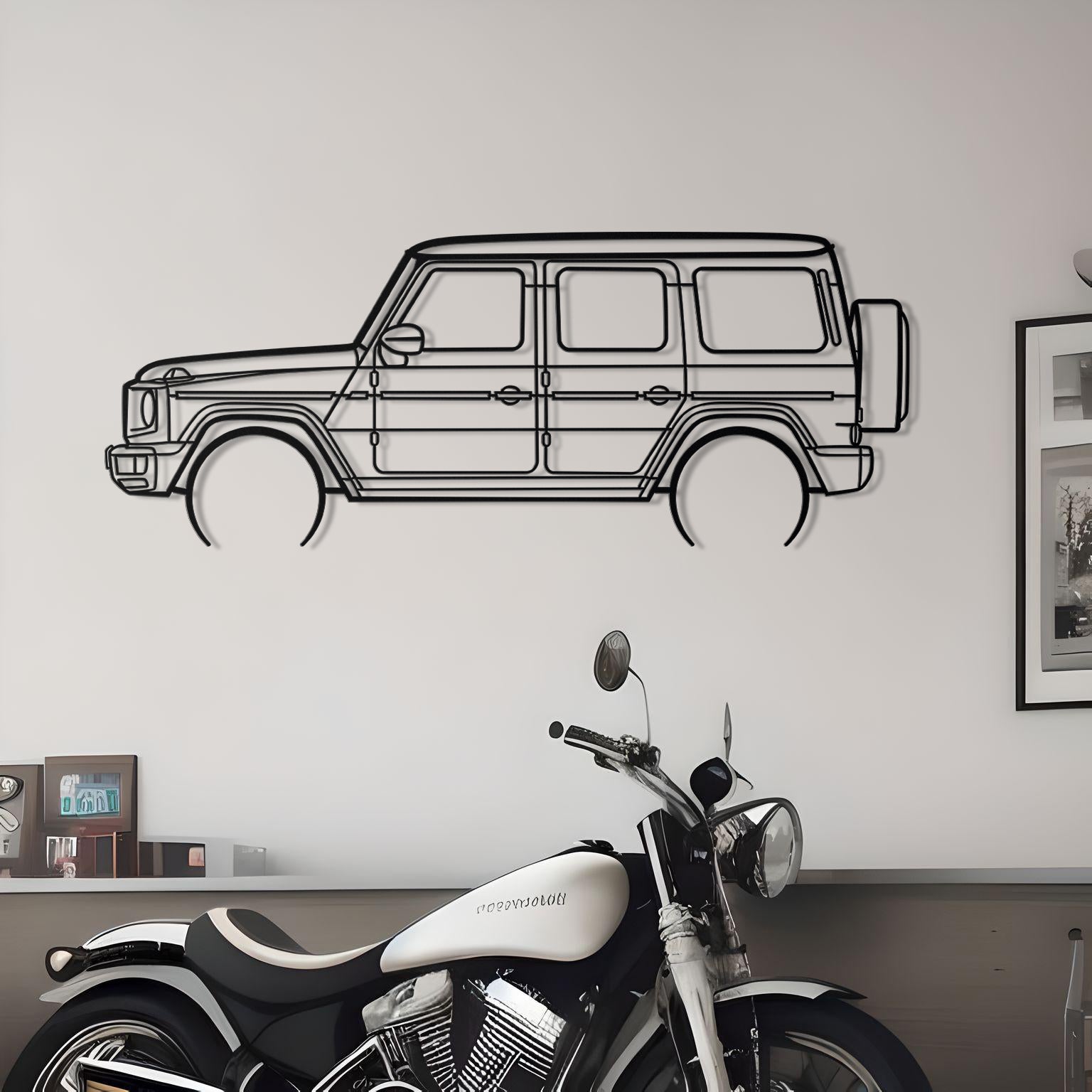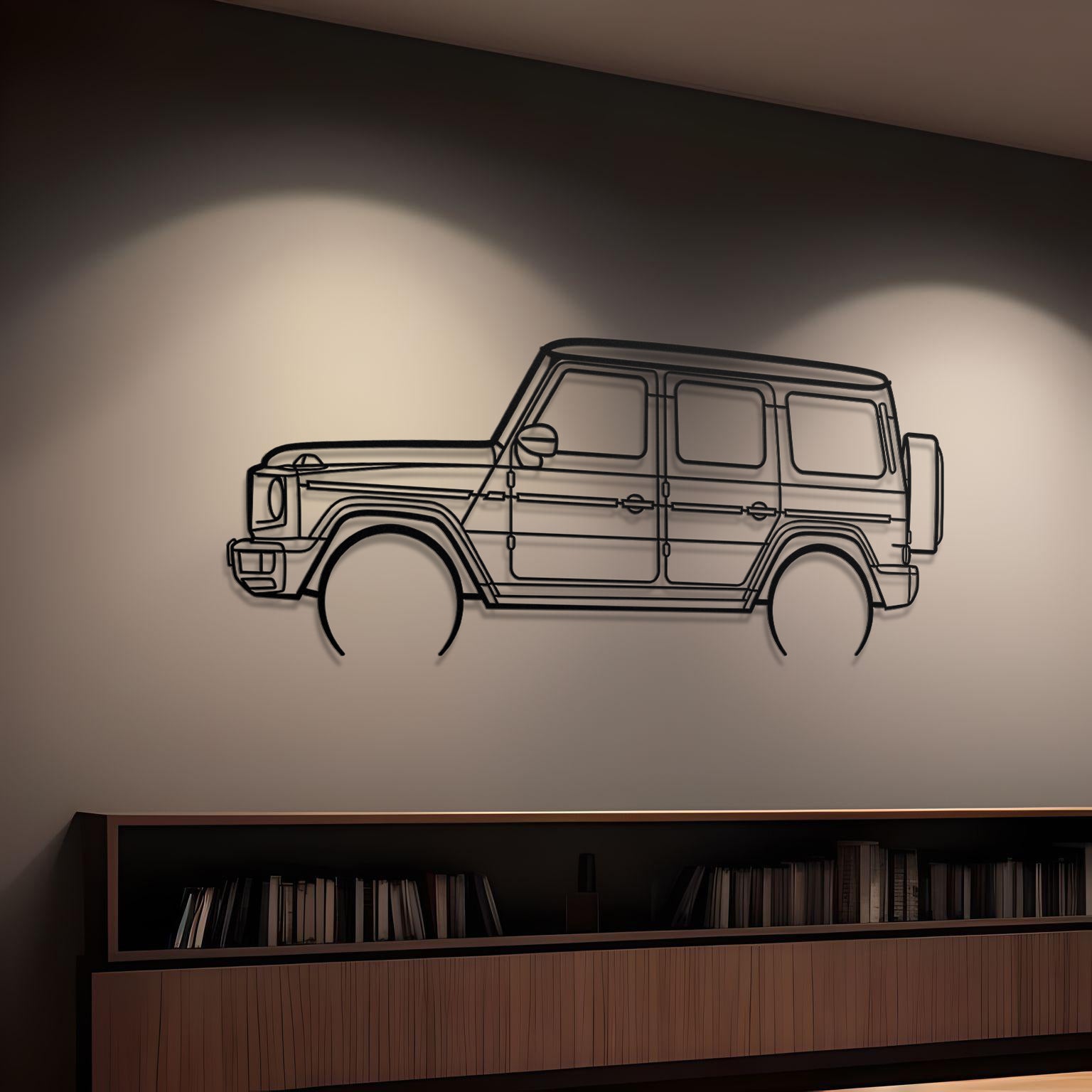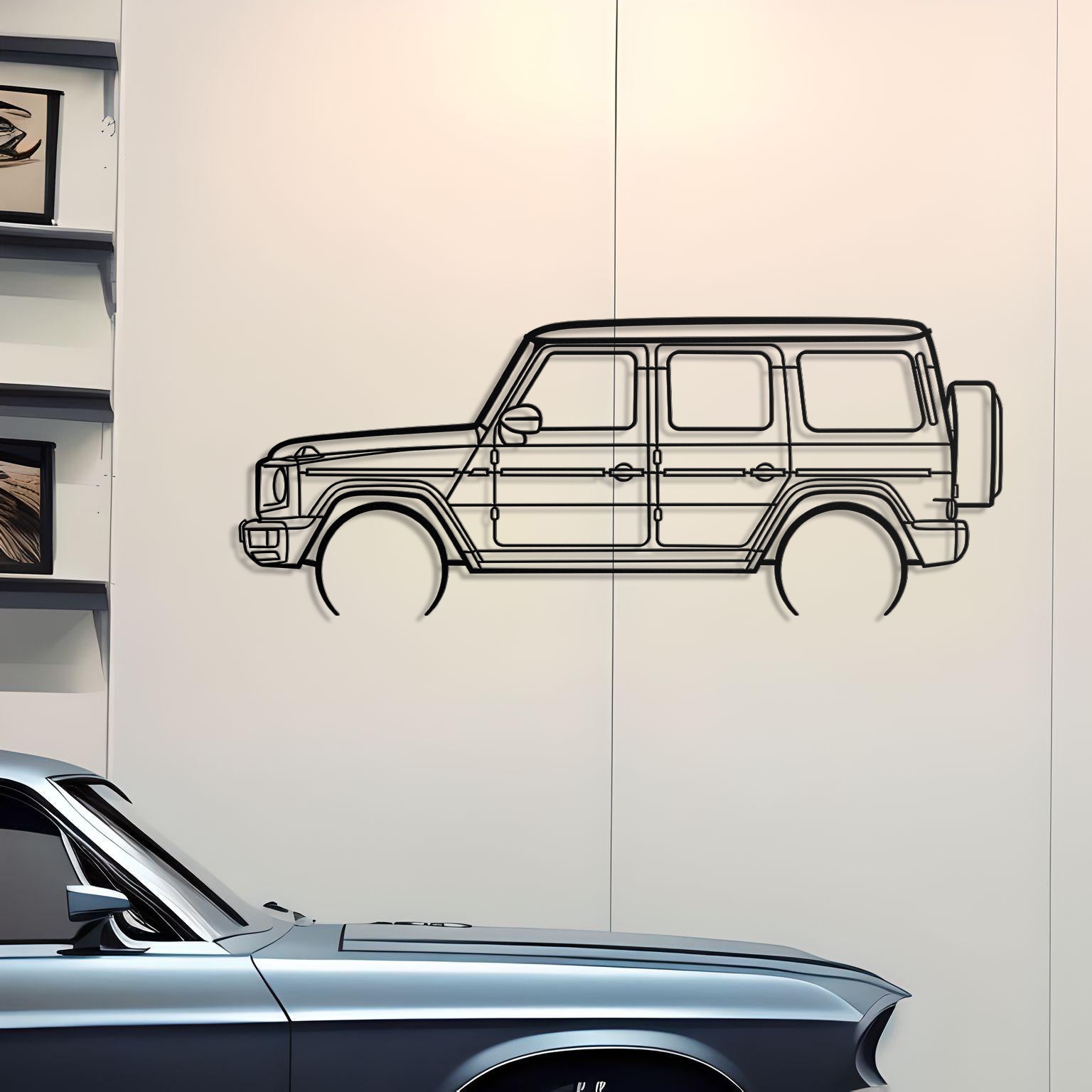 Channel the rugged elegance of luxury with this Mercedes‑Benz G‑Class 2020 line art metal wall decor. Precision laser-cut from premium 2 mm steel, the silhouette captures the unmistakable boxy form, round headlamps, and bold grille of the G‑Class W463 (2018–2024 generation). Finished in durable matte black powder coating, it combines minimalist line art with automotive prestige perfect for modern homes, garages, offices, or showrooms.