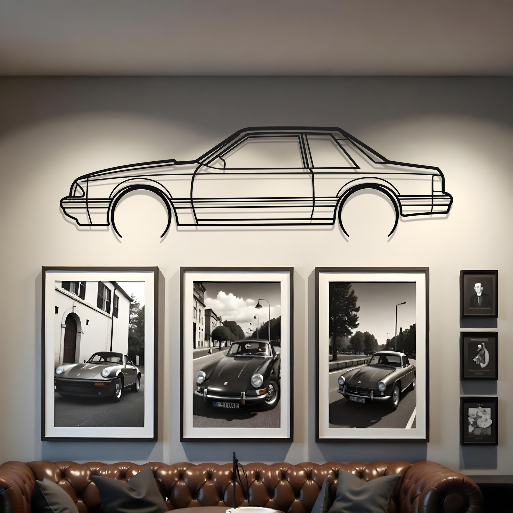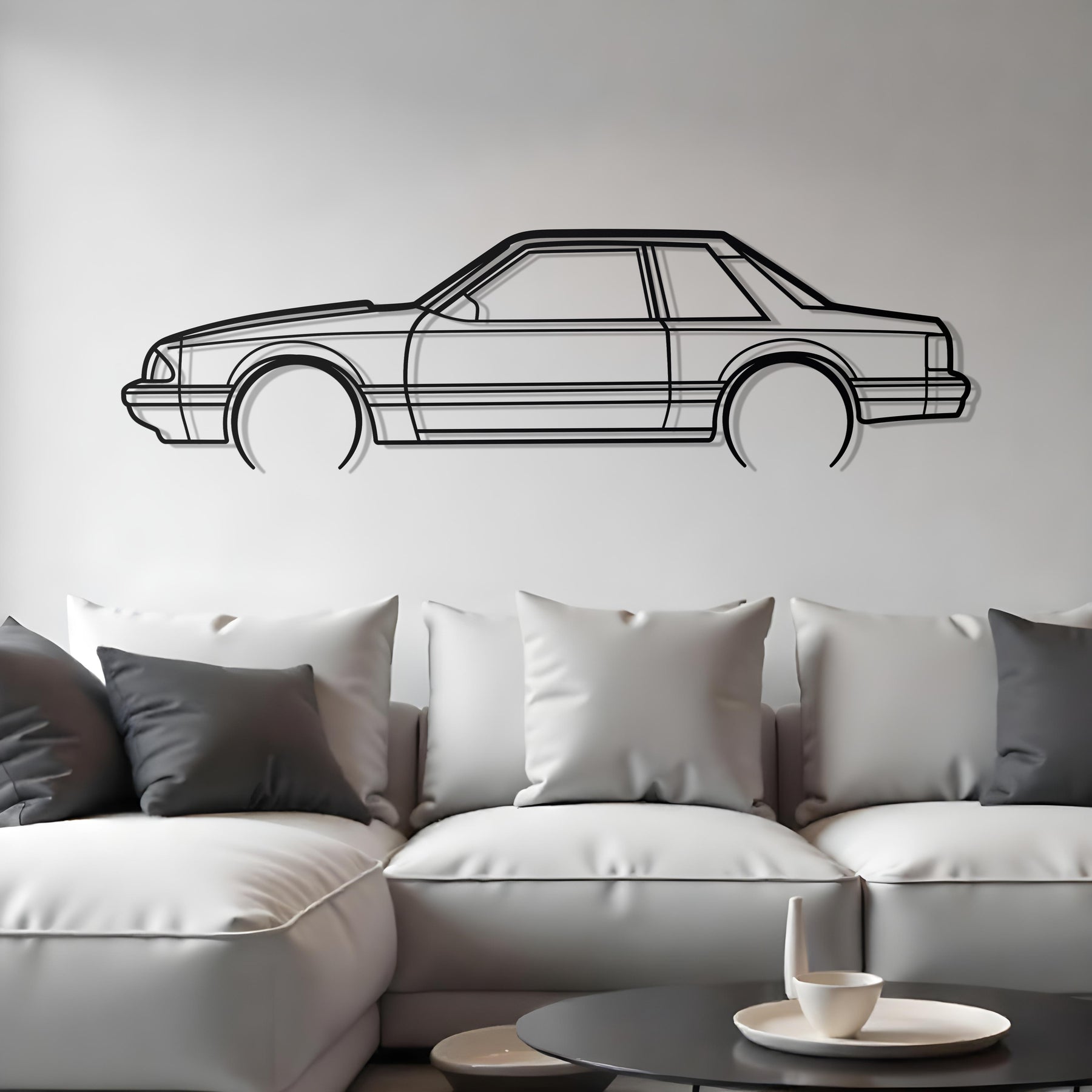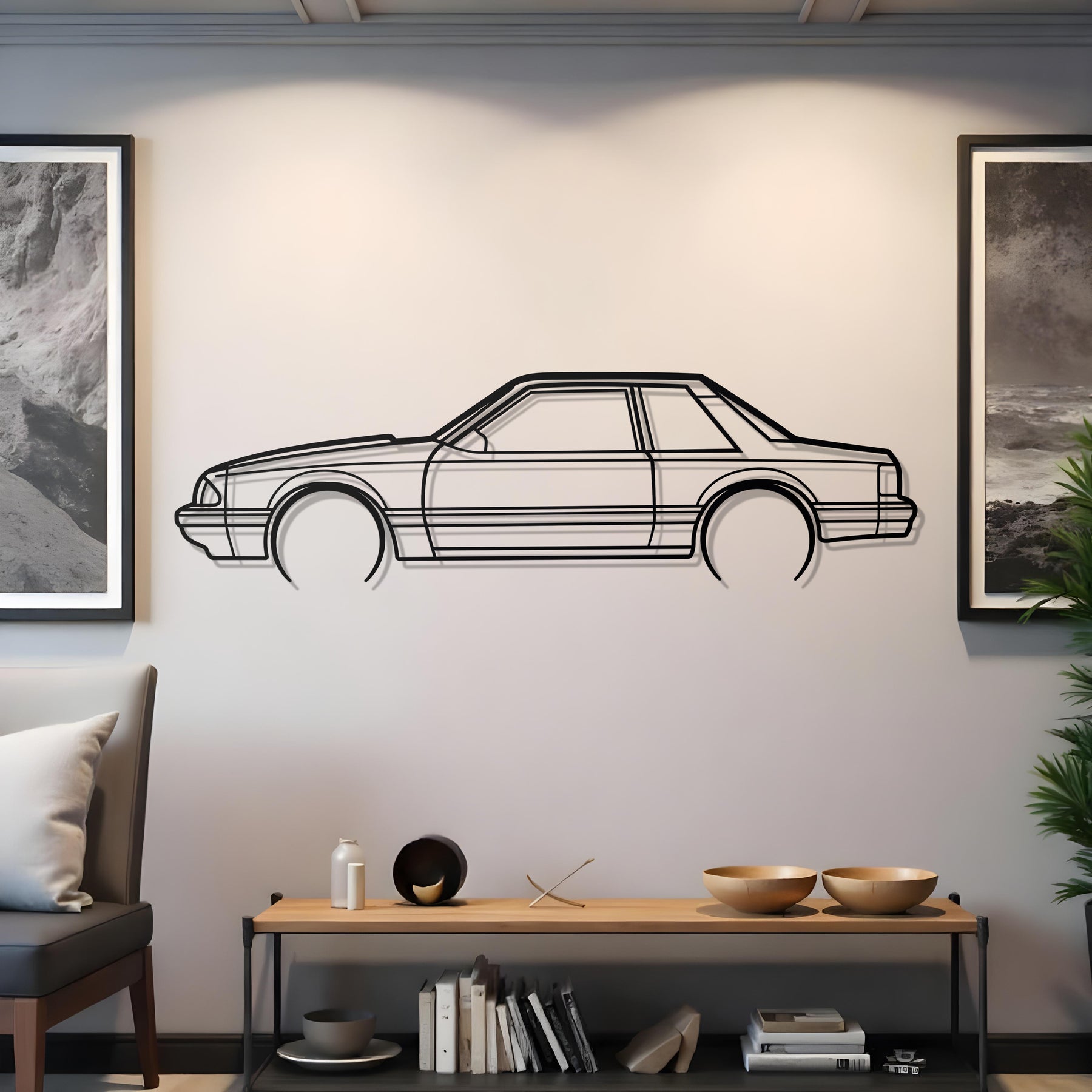 Bring a piece of automotive nostalgia into your space with this beautifully crafted metal wall art silhouette of the 1993 Ford Mustang Notchback (Fox-body) coupe. The refined line-art design highlights the classic profile seen between 1987 and 1993, featuring sharply defined roofline, trunk, and signature body lines typical of Fox-body Mustangs. Perfect for garages, offices, man caves, or modern interiors.