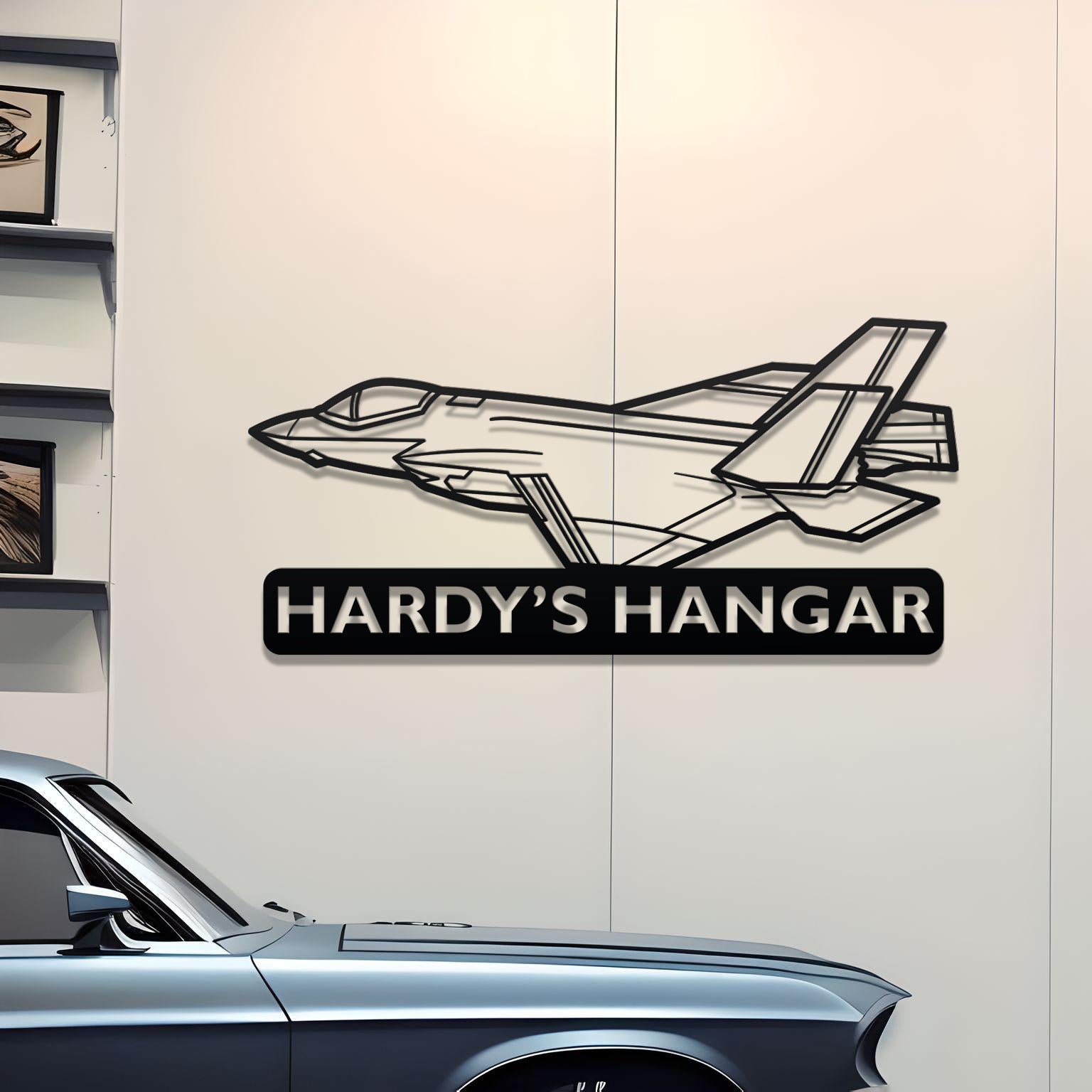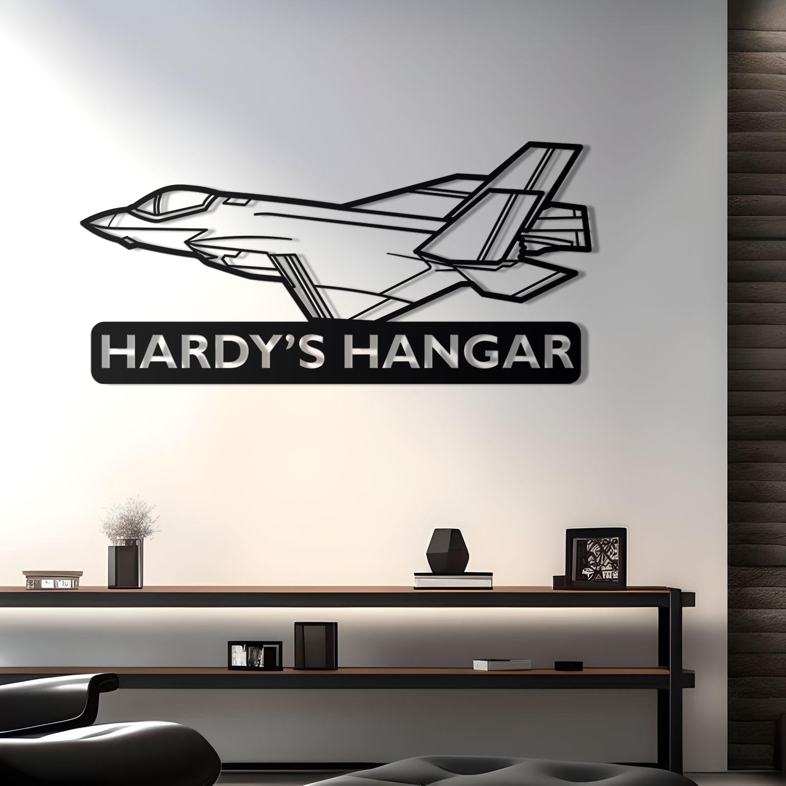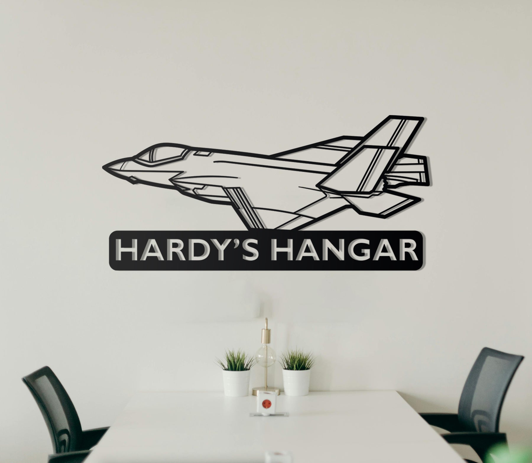 Make a bold statement with this F-35 Custom Name Silhouette Metal Wall Art—an expertly crafted tribute to the world's most advanced stealth fighter. Featuring a clean and detailed profile of the F-35 Lightning II, this wall art piece is precision laser-cut from industrial-grade steel and personalized with your chosen name or call-sign. Finished with a sleek matte black powder coat and mounted with 3D elevation, it's the perfect combination of military precision and modern design for any aviation lover’s space.