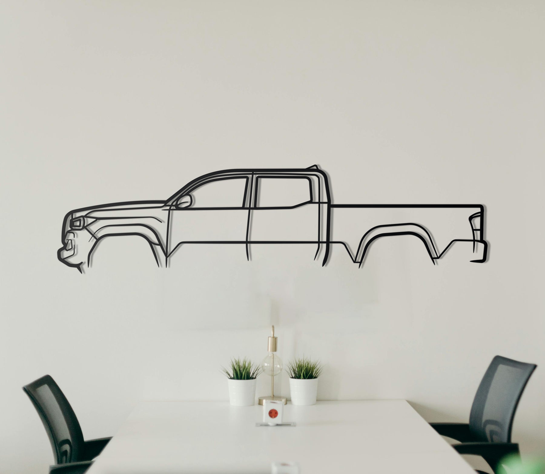 Bring rugged off-road style into your space with this 2023 Toyota Tacoma silhouette wall art. Crafted from 2 mm thick laser-cut steel, each piece highlights the iconic pickup’s bold profile—from its muscular wheel arches to signature grille outline. Hand-polished then coated in matte black powder finish, it delivers both striking style and durability. Featuring elevation screws for a subtle 3D floating effect (~1.5 cm off the wall), it’s ready to hang in garages, living rooms, man caves, or dealerships.