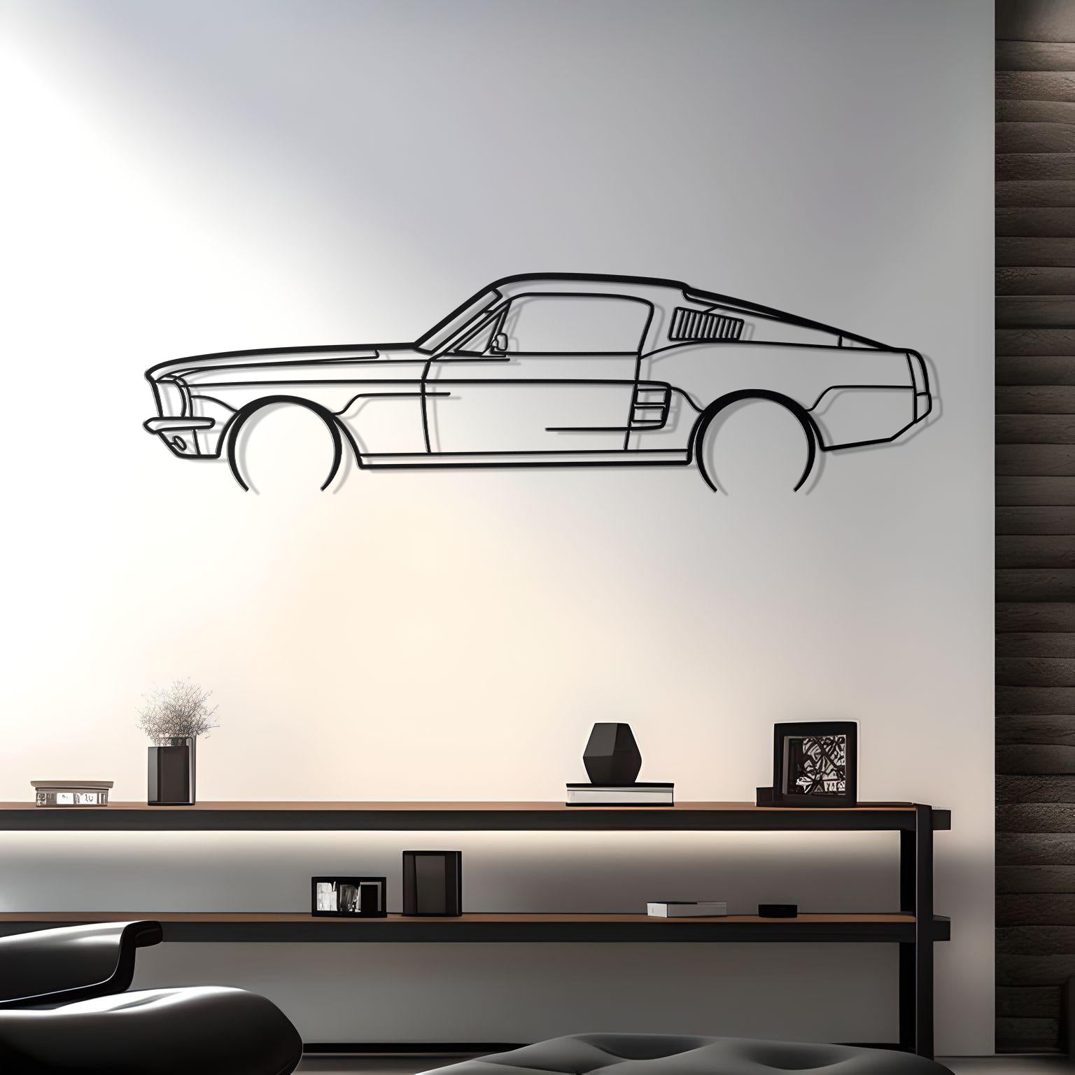 Immerse your space in automotive elegance with this laser-cut metal silhouette of the Mustang GT Fastback 390S. Crafted from robust 2 mm steel and coated in matte black, the minimalist line art captures the classic fastback profile with refined detail ideal for stylish halls, living spaces, garages, or studios.
